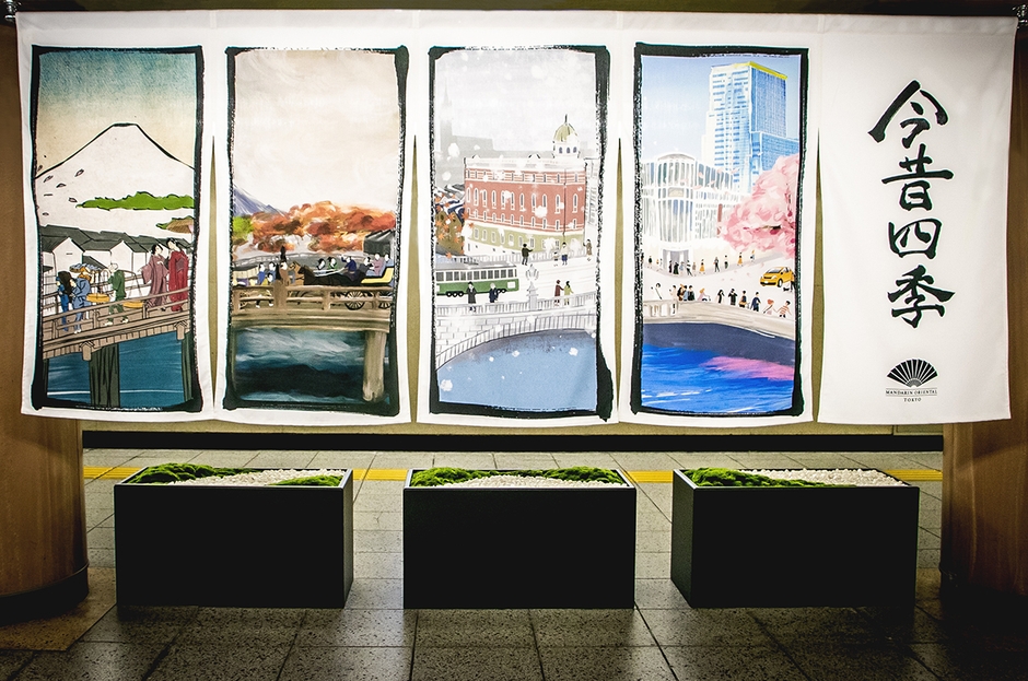 この度ののれんデザインは、当館が「センス・オブ・プレイス(Sense of Place)=立地する土地柄と文化に敬意を表するホテルづくり」というマンダリン オリエンタル ホテルグループの理念を、“現代の絵巻物風のれん”に置き換えた作品です。日本橋を象徴的に表す一枚の絵を、4コマ漫画をモチーフにした4枚の絵で構成し、ホテルが誕生するまでの日本橋の物語を、江戸時代から現代に至るまでの時代の流れと、四季の移り変わりで表現しています。その土地の歴史や伝統、文化を取り入れ、日本橋の歩みを大切にしながら未来へと進むのれんを見ていただくことにより、来街者に日本橋の魅力を感じていただきたいという思いが込められています。