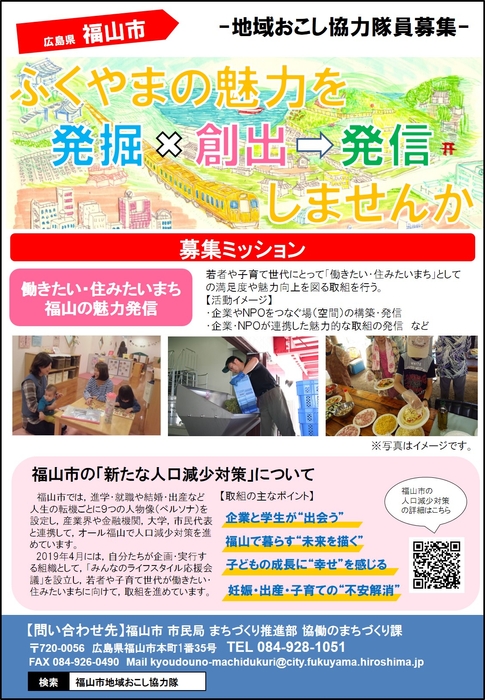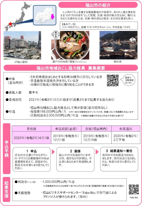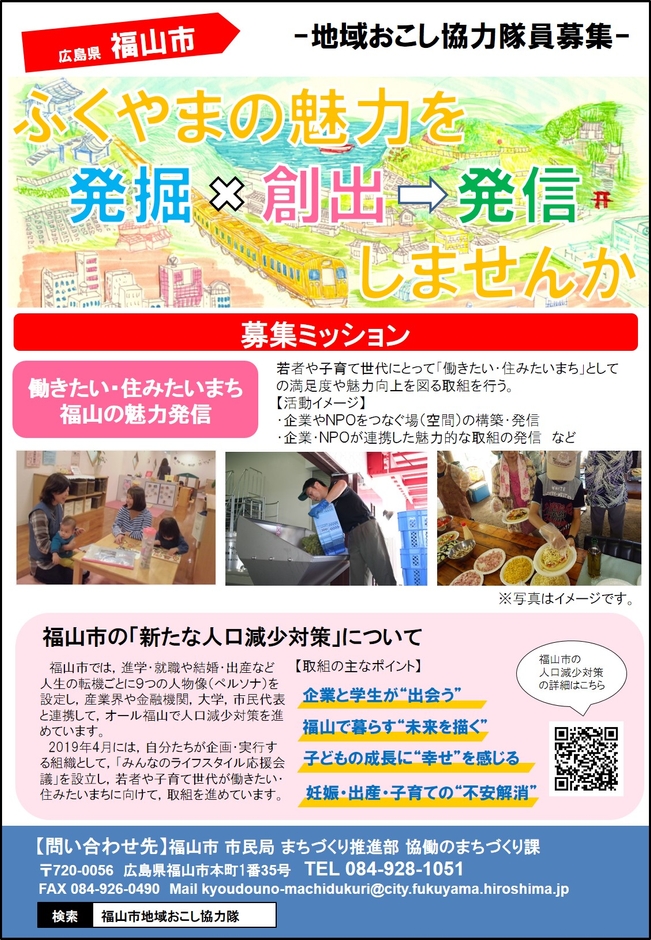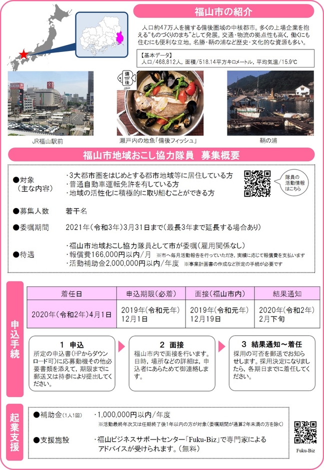 3大都市圏をはじめとする都市地域等から福山市内に生活の拠点を移し,一定期間,移住定住の促進や地域おこし支援などの地域協力活動を行いながら定住をめざす,福山市地域おこし協力隊員を次のとおり募集しています。