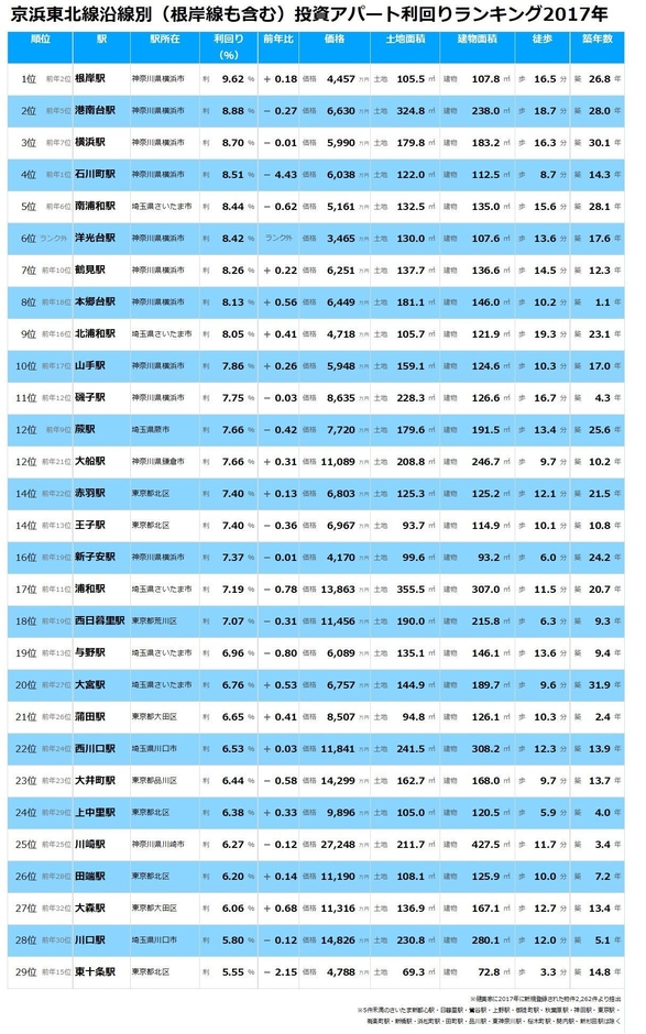 不動産投資と収益物件の情報サイト「 健美家( けんびや ) 」を運営する健美家株式会社( 本社:東京都港区、代表取締役社長:倉内敬一 )では、同サイトに登録された新規物件を集計し、「 京浜東北線沿線駅別アパート投資利回りの平均 」の調査結果をまとめましたのでお知らせいたします。