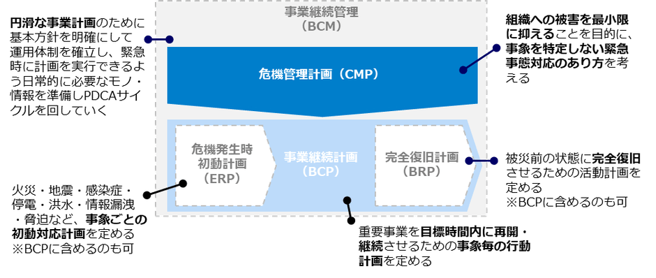 これからは、PDCAサイクルを回し常に最善な体制とするための事業継続管理(BCM)・事象にとらわれず危機発生後の意思決定体制や運用方法を定める危機管理計画(CMP)、初動対応計画(ERP)・完全復旧計画(ERP)を盛り込んだ真の意味で機能する事業継続計画(BCP)の策定が急務となっています。