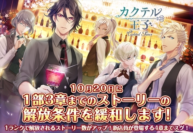 ギークス株式会社 (本社:東京都渋谷区、代表取締役社長:曽根原 稔人)が、株式会社gumi(本社:東京都新宿区、代表取締役社長:國光 宏尚)にライセンスを許諾した、ゲームアプリ『カクテル王子(プリンス)』(略称:カクプリ)において、10月20日(金)にストーリー解放条件を緩和し、11月上旬に新たなミニゲームやアシスト機能などを追加する大型アップデートを実施することをお知らせします。