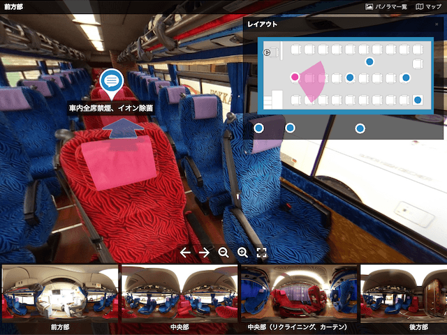 インフィニットループが開発したVRパノラマツアー作成サービス「Grooon(グルーン)」を活用し、バスの車内を360°見渡すことができるバーチャルツアーを提供します。「Grooon」を導入することにより、写真よりも臨場感あふれるプロモーションを実現します。