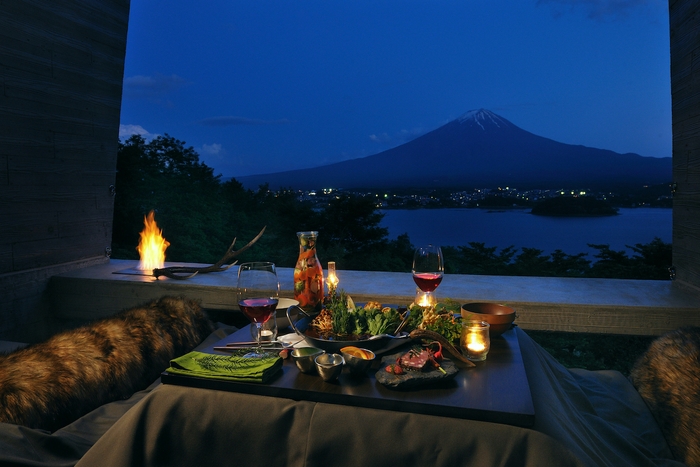 グランピングリゾートである星のや富士なら、キャビンと呼ばれるホテルの設備が整った客室に宿泊するので、ひとりでテントやタープを用意・設営する手間や時間は必要ありません。客室にいながら屋外を感じられるテラスリビングでは、富士山と河口湖の絶景を望むひとり時間が過ごせます。夕食はテラスリビングのこたつで食べる「山麓のしゃぶしゃぶ鍋」がおすすめです。秋冬の天候条件が良い日は、夜空にくっきりと浮かぶ富士山のシルエットと美しい星空という、ずっと眺めていたくなる絶景に出会えます。
