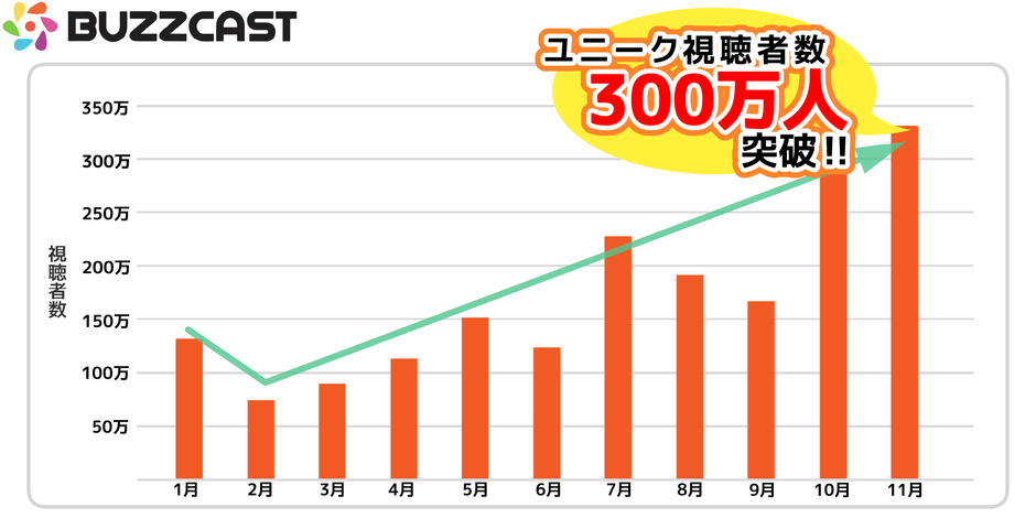 株式会社BUZZCAST(所在地:東京都豊島区、代表者:山田 雄介、以下 当社)は、当社が運営するYouTubeチャンネルにおいて、月間ユニーク視聴者数が300万を突破した事をご報告いたします。
