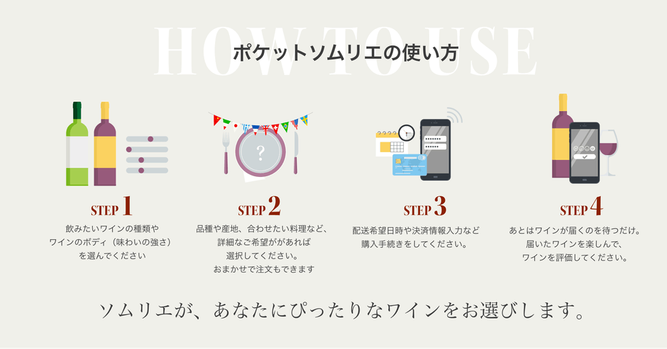 ワインに興味はあるが自分でワインを選べない、あるいはワインが好きだが自分で選ぶのが面倒だ、もしくは自分の知らない自分好みのワインに出会いたいという方が、簡単手軽に最適なワインを購入できます。