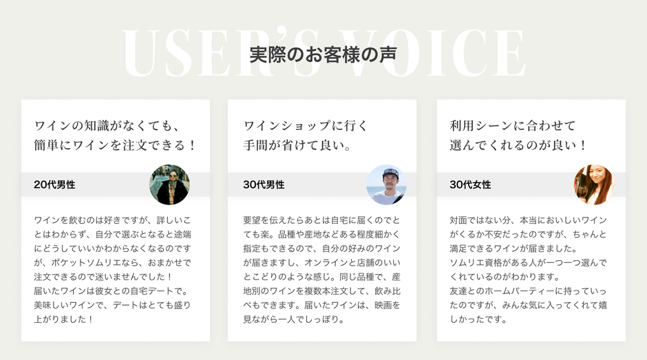 「料理や好み、雰囲気、気分、シチュエーションなどにあったワインをソムリエに提供してもらい、感動的なワインに出会い、素晴らしい時間を過ごす」というレストランやワインバーなどでなし得る体験を、お店以外でももっと気軽に多くの人に味わってもらいたいという思いから、その体験をスマートフォンやパソコンを通してオンラインで実現しようと試みました。