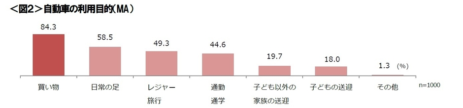 ・利用目的は「買い物」が84.3%と最も高く、次いで「日常の足」58.5%、「レジャー、旅行」49.3%となった <図2>