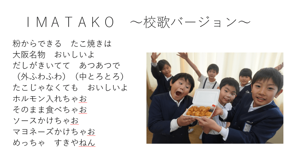 さらに、たこ焼きをPRするオリジナルソングを披露。新今宮小学校校歌の替え歌になっているので、すぐに全員で歌うことができ、大合唱して最後には「やっぱ好きやねん」という歌詞で締めくくりました。