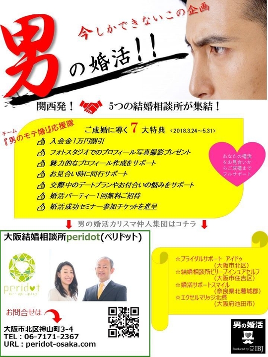 仲人型結婚相談所である大阪結婚相談所peridot(ペリドット、所在地:大阪府大阪市、代表:村上 利治)は、2018年3月24日(土)より男性を対象とした婚活サービスのキャンペーン「今しかできないこの企画 男の婚活!!」を開始いたしました。本キャンペーンは婚活市場に不足する男性会員を増やし、成婚数を増やす取り組みの一環として、男性の婚活を応援するもので、株式会社IBJ(証券コード:6071)バックアップの元、70チーム(約160社)が一丸となって行う少子高齢化対策・婚活応援のひとつです。