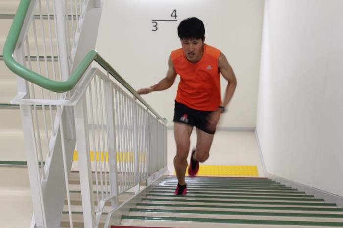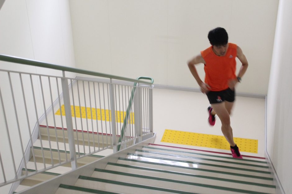 理大A1号館は高さ55メートル、最上階の11階までは高さ約46メートル。吉井さんは手すりを使わない場合と使った場合の2種類について、1回から最上階まで駆け上がり、走りを確かめていました。ちなみに、手すりを使わなかった場合は62秒、使った場合は58秒。「いい階段。同じリズムで走れて良かった。これから練習できるビルが増え、階段垂直マラソンが盛んになれば」と話していました。