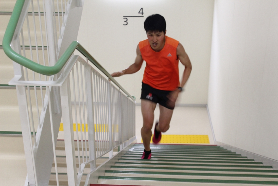 階段垂直マラソンは、高さ300メートルの大阪市「あべのハルカス」や東京タワーで大会が開かれ、マイナーながら注目され始めています。階段の段差に合わせた走りや踊り場での回転、手すりの使い方などテクニックがあり、通常の走りとは違う面白さがあるそうです。吉井さんは4年ほど前にあべのハルカスの大会に出て魅力を知り、以来神社の階段などで練習。しかし、実践には程遠く、春季休業中の大学の許可を得て訪れました。