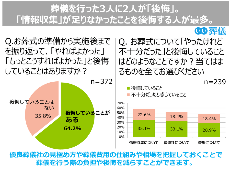 葬儀を行った3人に2人が「後悔」 葬儀で後悔しないためには 「葬儀の知識習得」と「事前の情報収集」が決め手に 「いい葬儀」が後悔しない葬儀をサポートする無料サービスを開始