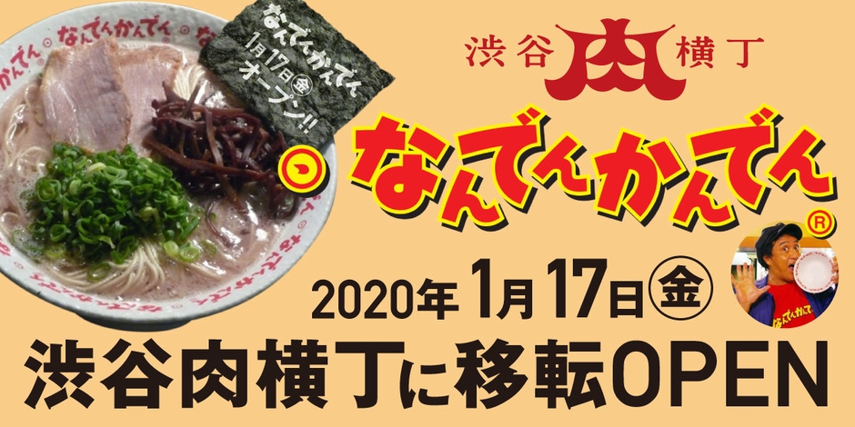株式会社飲食店プロモーター(本社:東京都渋谷区、代表取締役:黒田佑輔)は、2020年1月17日(金)17時に、日本最大級の肉のテーマパーク「渋谷肉横丁」内に、全国にラーメンブームを巻き起こした伝説の店「なんでんかんでん」をオープンします。提供させていただくラーメンのスープは、「なんでんかんでん」史上最高の濃度です。