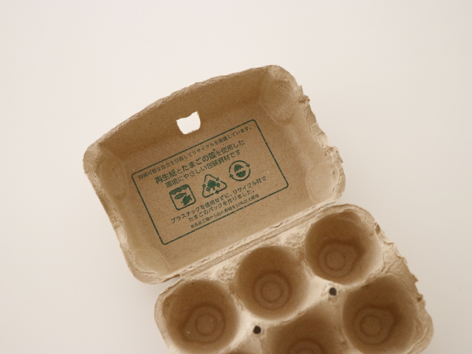 持続可能な社会を目指して再生紙とたまごの殻を再利用した 環境にやさしい包装資材を導入します
