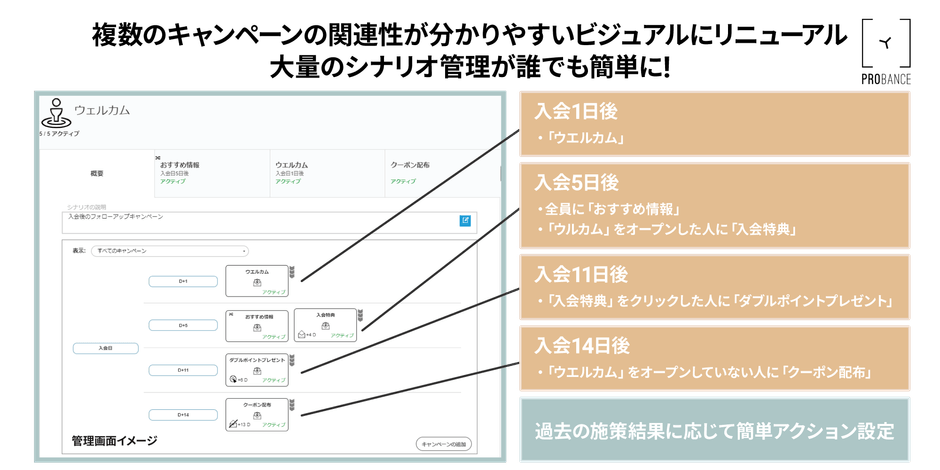 「Probance」は大量のキャンペーン管理が可能である点を強みにしており、今回の「ビジュアルシナリオマネジメント」では、管理画面上の複雑なフロー記述を避け、設定を確認したいキャンペーンにマウスオーバーすることで、設定内容、プレビュー、そのキャンペーンに紐づく全てのキャンペーンの配信タイミングを確認できるようになりました。加えて、キャンペーン同士の関連性についてコメントも記述できるようになり、誰が見てもどのキャンペーンがどのように組み合わさっているのかがわかるようになりました。