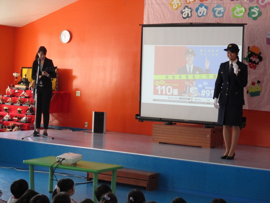 その後集まった園児と共に110番についてのクイズに挑戦しました。