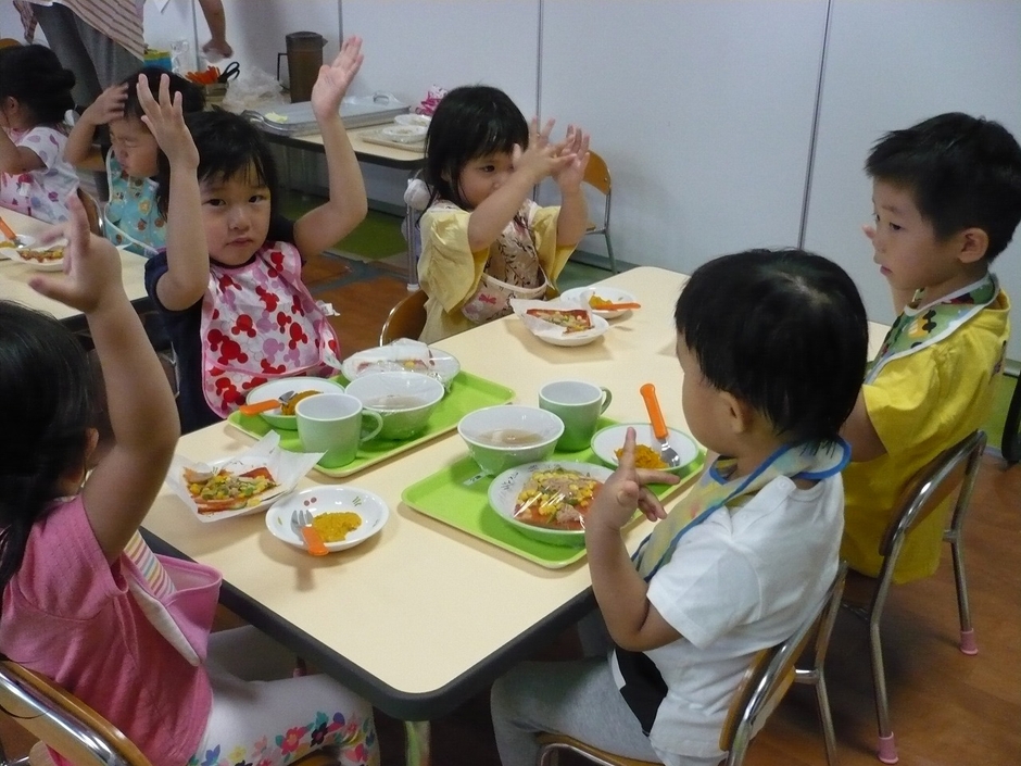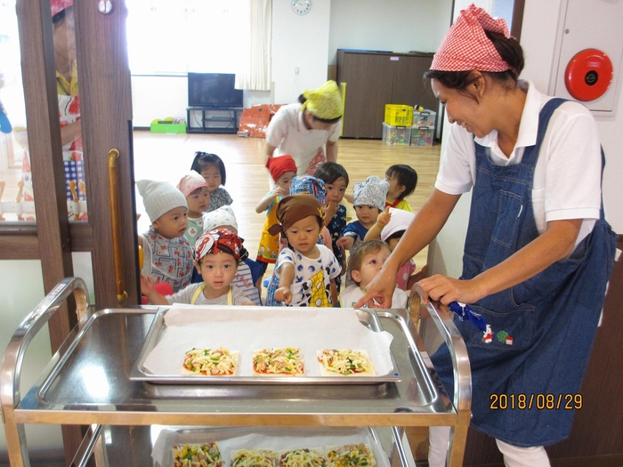 当日は園児たち約100人が参加しました。トイレを済ませた後、手洗い、消毒をし、エプロン、三角巾等で身支度をしました。乳児クラスでは一人ひとりが食パンにピザの具をのせ、トレーに入れて調理室に持っていきました。3歳児以上のクラスでは、グループごとに調理。生地の材料をボールの中で混ぜてぬるま湯を加え、テーブルの上でこねてから人数分に分けて麺棒で伸ばしました。具材をのせて出来上がったものを調理室で焼いてもらいました。園児たちは「自分で作ったからおいしいね」と、喜んで食べていました。