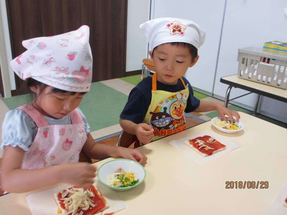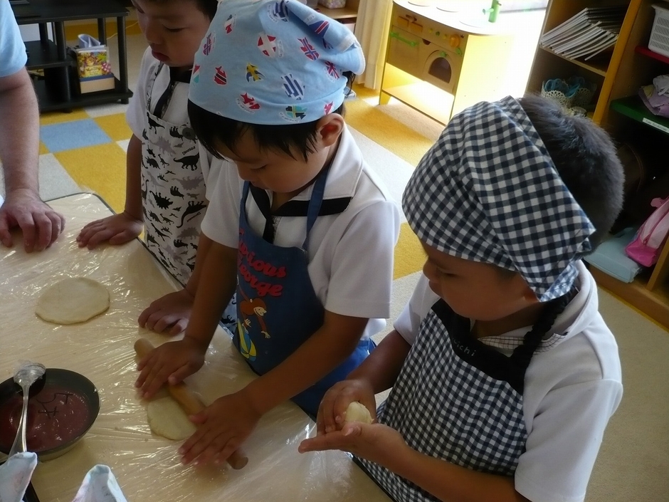 5歳児までの教育保育に取り組んでいる御影インターナショナルこども園(神戸市東灘区、西野雅二園長)は、2018年8月29日、本園にて、知育・徳育・体育の基礎となる食育の一貫として「食育クッキング(ピザ作り)」を開催しました。