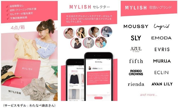 「MYLISH」は、セレクターと呼ばれる、Instagramやブログなどで注目を集めるインフルエンサーが選んだトレンドアイテムを、月額8,980円(税抜き)で何度も借りることができるファッションレンタルサービスです。サービス開始当初の取り扱いブランドは、AVAN LILY、AZUL、ECLIN、EMODA、EVRIS、fifth、MOUSSY、MURUA、rienda、RODEO CROWNS、SLY、Ungridの12ブランド以上となっており、ブランド、アイテム共に随時拡充予定です。