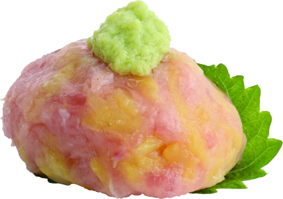 本商品は、「まぐたく」の中にシャリを入れた、見た目にも驚きの、まさに進化系まぐろ寿司です。トッピングには、スシロー初登場となるわさびの辛さを抑えた風味際立つ“オリーブわさび”をご用意いたしました。