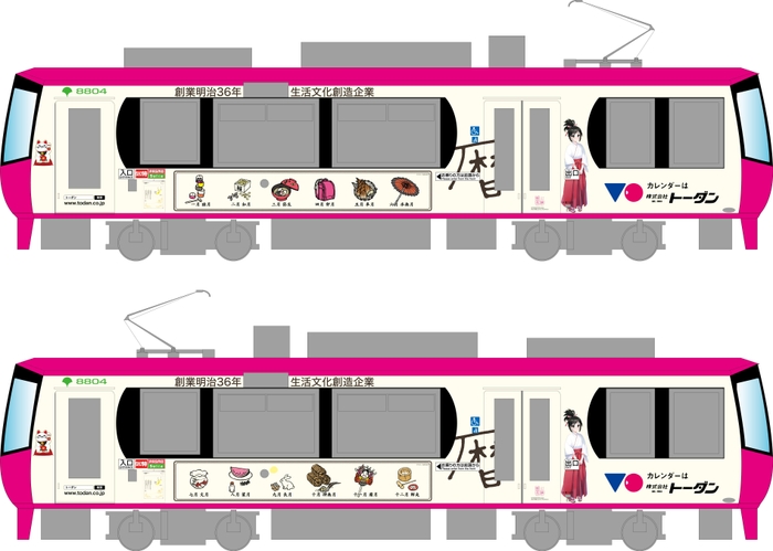 明治36年創業の大手カレンダーメーカー、株式会社トーダン(代表取締役社長:強口邦雄/所在地:東京都荒川区/ https://www.todan.co.jp/ )は、2020年3月4日(水)から2021年3月3日(水)まで、東京都交通局が運行する東京で唯一の路面電車、東京さくらトラム(都電荒川線)の三ノ輪橋駅から早稲田駅まで(12.2km)の区間において車両ラッピング広告を行います。