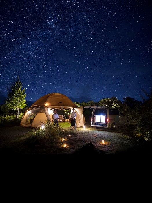 日産の電気自動車(EV)の電源を活用することで、大自然の真ん中にいながら、電気を使ったプレミアムな演出やおいしい料理を堪能できます。EVならではの静けさで自然の音がBGMとなります。暗くなれば、天候に恵まれると月光や星の瞬きが夜空を彩り、いつまでも眺めていたいほど心洗われます。自然を五感で感じながら、自然に癒されるプレミアムプランです。