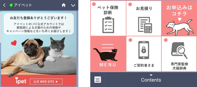 アイペット公式アカウントでは、スマートフォン上で手軽に保険の相談や契約手続きが出来るだけでなく、当社発行の保険証提示で病院窓口精算(※)が可能な「アイペット対応動物病院検索」やペットとの生活をサポートする優待サービス「クラブアイペット」、専門家監修による飼い主さま向け情報サイト「ワンペディア」「にゃんペディア」等のサービスも提供し、お客さまにとって利便性の高いサービスを提供することを目指してまいります。