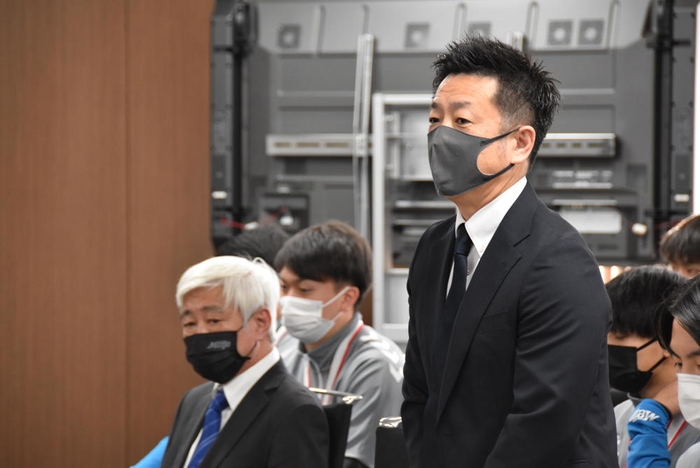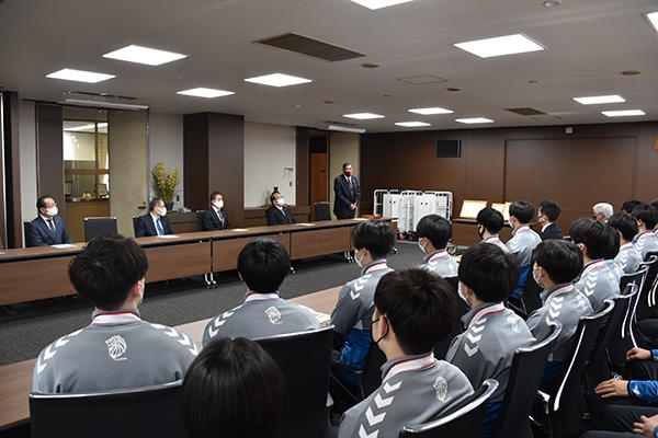 小原学長は「初めてハンドボールの試合を見させてもらい、たくさんの感動をいただいた。明治大の試合は圧巻で、日本体育大の試合はドキドキしながら見ていた。日本体育大戦を振り返り、何が欠けていたかを考え、少しでも積み上げて、来年に期待しています」とあいさつし、立花理事長は「試合を見て、ハンドボールに一層興味がわいた。普段の練習が夜遅くに行われていると聞き、苦労しながらここまでの成績を残してくれて有難い。今後も物心両面で支援していきたい」と労いました。