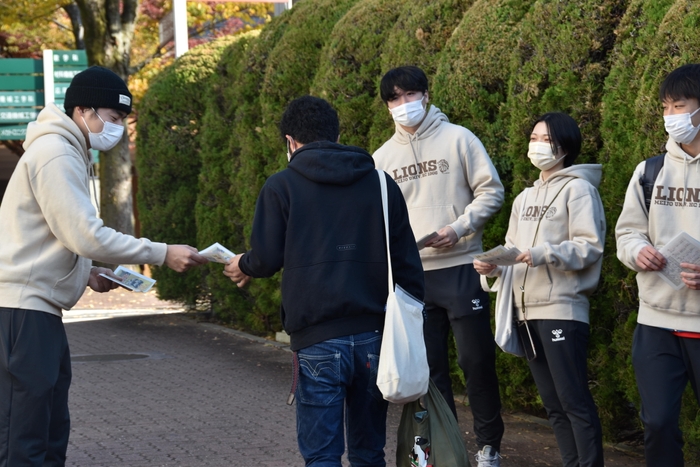 11月9日には天白キャンパスで朝のあいさつ運動に参加し、部員たちは気持ち良くあいさつ。学生や教職員に全日本インカレ3位のチラシを配布しながら、応援へのお礼も行いました。チラシを受け取った学生や教職員からは「おめでとうございます」との声が相次ぎました。