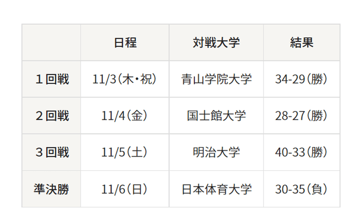 続く3回戦の明治大学との対戦では、連携が上手く機能し、チーム一丸となったディフェンスで準決勝進出。