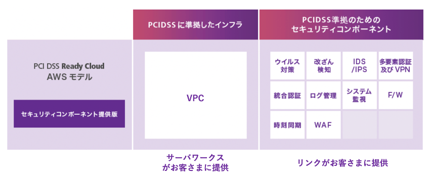 サーバーワークスは、PCI DSS準拠が求められるインフラが必要な事業者に対し、リンクの「PCI DSS Ready Cloud AWSモデル」を共同で提案します。サーバーワークスはVPCを、リンクはPCI DSS準拠に必要なセキュリティコンポーネントを提供します。