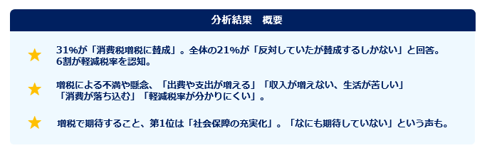 増税に関して反対と回答した方に理由を伺ったところ、「出費/支出が増える」、「収入が増えない、生活が苦しい」、「消費が落ち込む」、「軽減税率が分かりにくい」などの不満や懸念の声が抽出されました。具体的なコメントも紹介します。