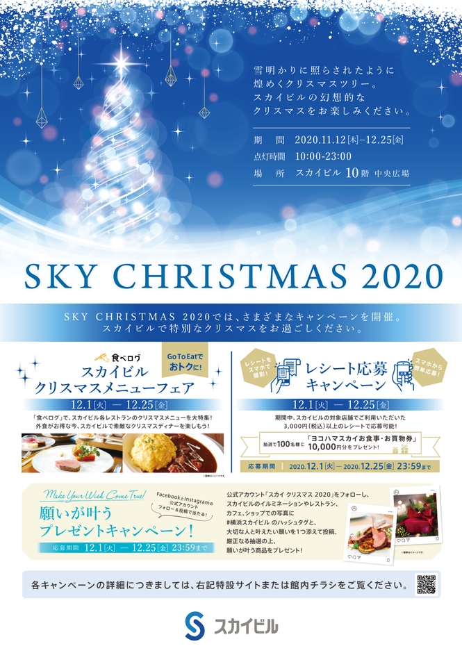 ■内容:クリスマスシーズンを彩る特別な演出を館内各所にて開催中です。目まぐるしい変化が起きている2020年の日常の中、スカイビルでゆったりとした時間を過ごしていただくため、「癒し・安心感」を表現するブルー・ホワイトを基調とした装飾で特別な空間を演出しています。10階中央広場の吹抜けには高さ6mのクリスマスツリーを展示しております。また12月1日(火)からは食べログとのタイアップ企画『クリスマスメニューフェア』、スマホだけで応募が完結する『レシート応募キャンペーン』、Facebook・Instagramのフォローと投稿でプレゼントが当たる『願いが叶うプレゼントキャンペーン』を開催いたします。お食事・お買い物と併せて、この時期だけの特別なスカイビルを是非お楽しみください。