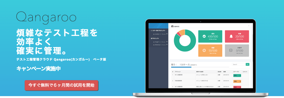 Qangarooはソフトウェア開発における煩雑なテスト/デバック工程を、効率よく、確実に管理するためのクラウド(SaaS)サービスです。テスト内容や進捗に関わる数百行から数万行にわたる巨大なExcel(R)ファイルの手集計管理を行う開発現場における集計時間の短縮やヒューマンエラーを防ぎ、リアルタイムに一元管理することが可能になります。