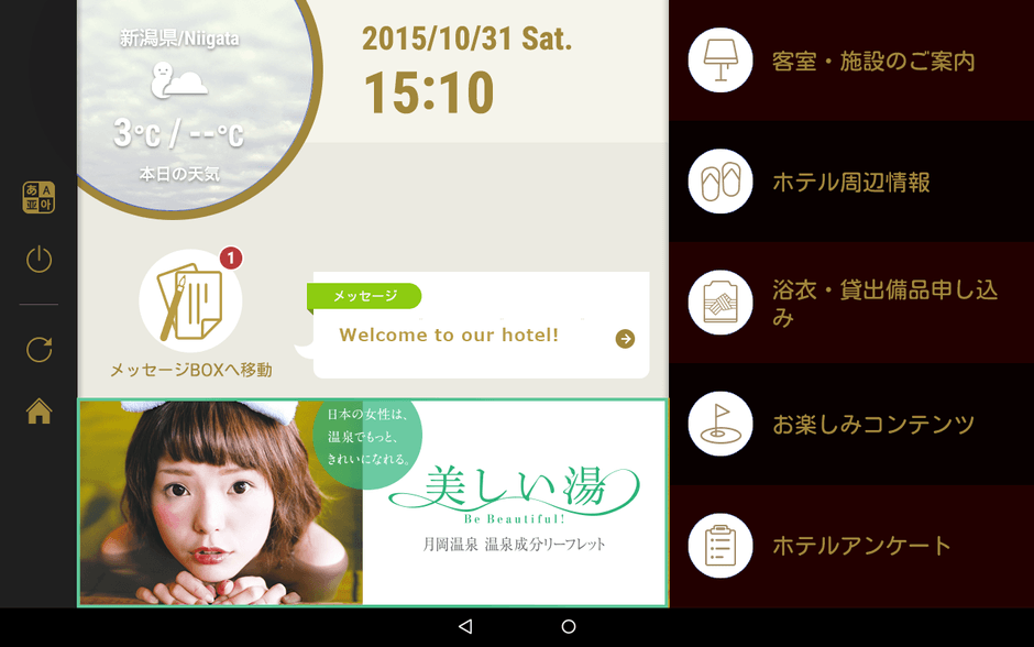館内案内、天気、観光スポット案内や、動画、電子書籍・地域コンテンツ、メッセージ配信など