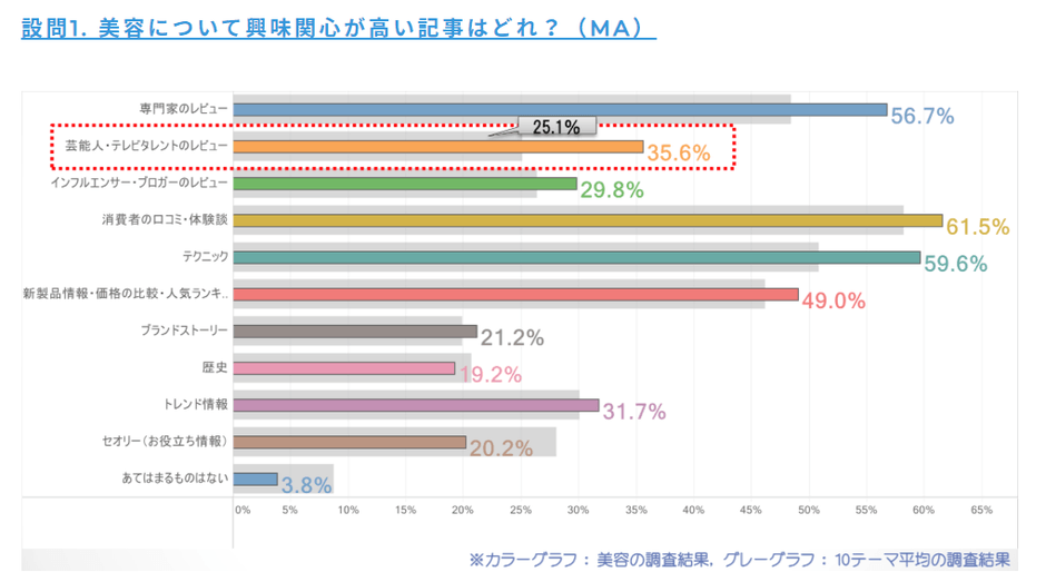 今回美容を含む10カテゴリーの調査結果と比較し(図表のグレー棒グラフが10カテゴリーの平均値)、美容のウェブコンテンツを読む読者の傾向値をとらえました。結果、上位の「消費者の口コミ・体験談(61.5%)」「テクニック(59.6%)」「専門家レビュー(56.7%)」は他カテゴリーと同様でしたが、「芸能人・テレビタレントのレビュー(35.6%)」が平均値を1.4倍強上回っており、芸能人等が発信する情報に関しては、他カテゴリーに比べて興味が薄れていないことが伺えました。