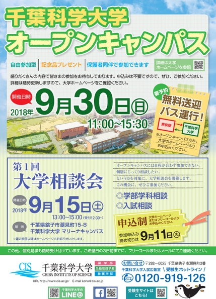 千葉科学大学(千葉県銚子市潮見町)は、2018年9月30日(日)、大学のマリーナキャンパスにて第5回オープンキャンパスを開催します。自由参加型、保護者同伴可能です。先輩との交流でキャンパスライフの姿がわかります!
