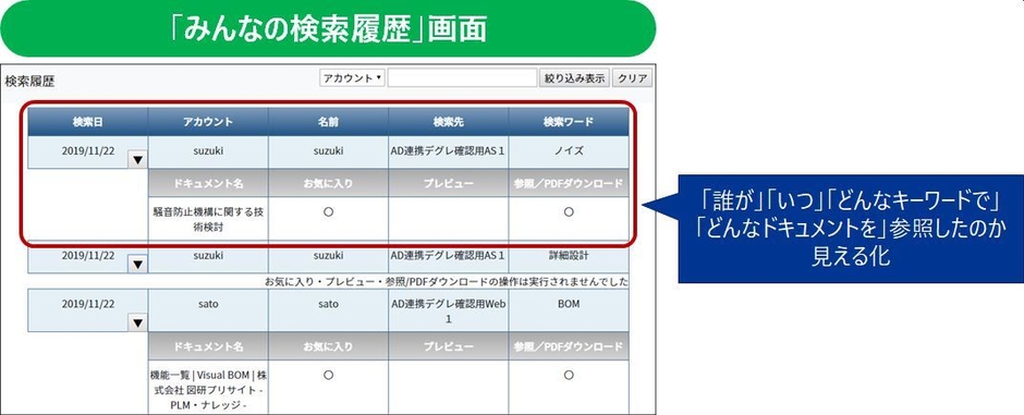 自分以外のユーザーが、企業内のドキュメントをどのようなキーワードで検索し、得られた検索結果からどのようなドキュメントを参照したのか確認できます。ドキュメント検索時の行動や判断が可視化されるため、例えば、ベテラン社員の検索履歴を他ユーザーが参照することにより、社員一人ひとりの情報検索力が向上します。