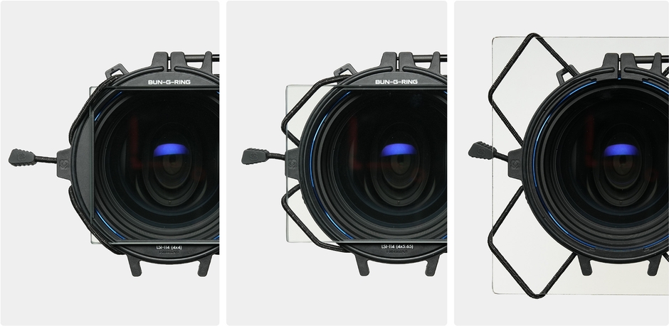 BUN-G-RINGは4×5.65サイズや6.6×6.6サイズなどのあらゆる角形フィルターサイズに対応し、最大5枚のフィルターを重ね付けすることができます。