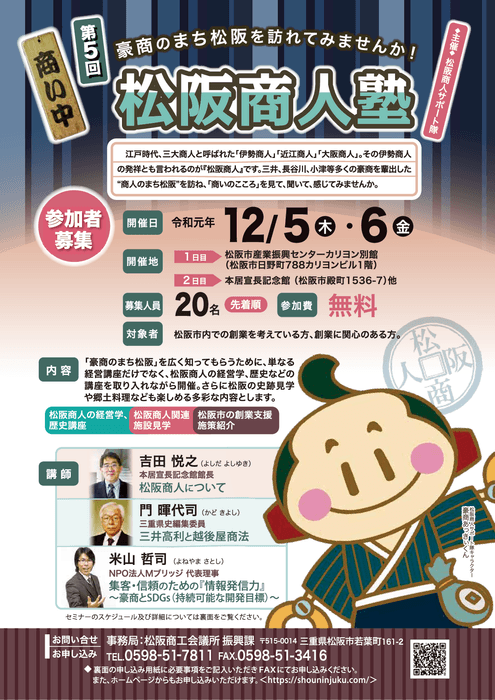 松阪商人サポート隊(運営:松阪商工会議所 振興課)は、全国の創業希望者を対象とした第5回「松阪商人塾」創業セミナーを2019年12月5日(木)・6日(金)に、三重県松阪市にて開催します。