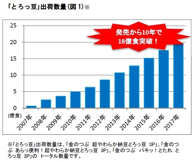 株式会社Mizkan(本社:愛知県半田市、以下ミツカン)が、2007年7月に発売した「金のつぶ 超やわらか納豆とろっ豆 3P」(現在は「金のつぶ パキッ!とたれ(TM) とろっ豆 3P」、以下「とろっ豆」)は、2017年7月に発売から10周年を迎え、通算出荷数量が18億食を突破いたしました(図1)。発売10周年を迎えることができたことへの感謝の気持ちをこめて、全12種類のデザインパッケージ(参考資料 資料1)を2018年1月14日(日)より期間限定で発売いたします。パッケージは、10周年を迎えたこと、18億食突破したことを表したデザインです。