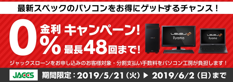 パソコン工房・グッドウィルを運営する株式会社ユニットコム(代表取締役:端田 泰三、本社:大阪市浪速区)は、パソコン工房Webサイトおよび全国のパソコン工房・グッドウィル各店舗にて、ジャックスローンをご利用の場合、分割支払い金利手数料が最大48回まで無料になる『ショッピングローン0%金利キャンペーン』を2019年5月21日(火)より開始しました。