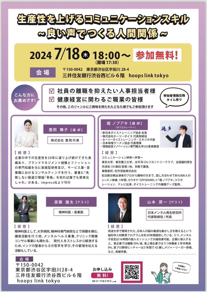 『生産性をあげるコミュニケーションスキル~いい声でつくる人間関係~』をテーマにメラビアンの法則(第一印象は見た目の印象が9割)から、外見と声を切り口に、新日本ボイストレーニング協会の堀会長や日本メンタル再生研究所山本所長、精神科医の齋藤医師を講師に迎え講演します。