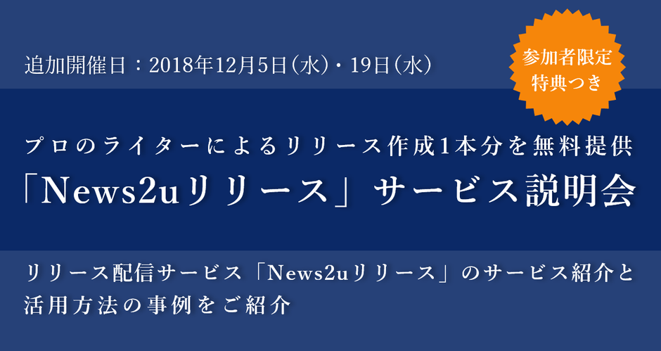 リリース作成1本分が無料になる参加者限定特典つき!「News2uリリース」サービス説明会を12月5日(水)・19日(水)に追加開催
