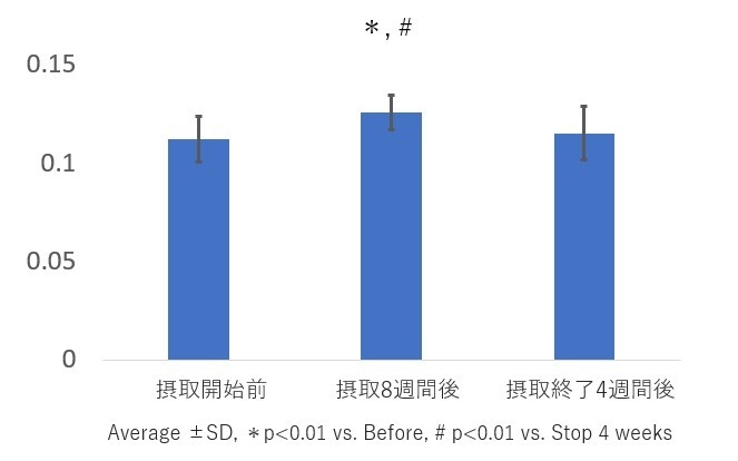 ・5段階評価のアンケートからは、摂取前の「白髪」、「抜け毛」の評価の平均はそれぞれ、摂取前2.38±1.4、3.00±1.4であったが、摂取後はそれぞれ3.06±1.4、3.75±0.70と有意な改善が確認できた。