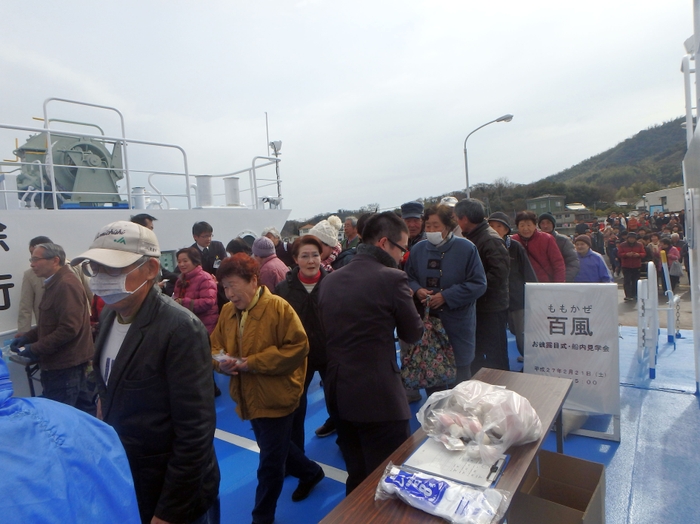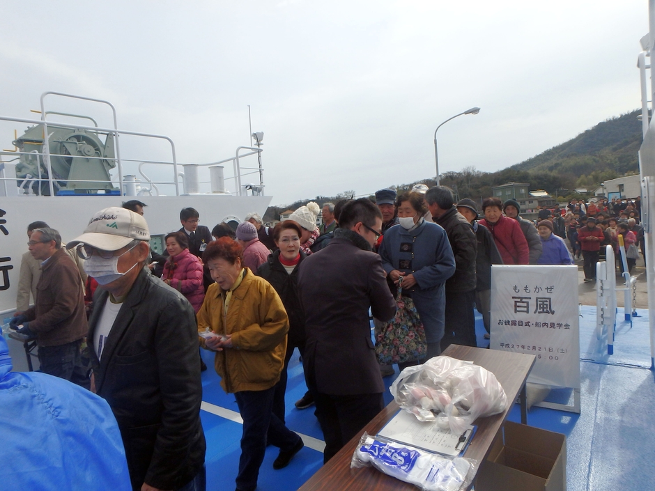 セレモニーで平谷祐宏尾道市市長は「百島航路は、離島である百島と本土を結ぶ唯一の公共交通機関として、重要な役割を担っています。百風を、皆さまの生活の足として、また島内・島外の交流促進にご利用いただき、可愛がっていただければ幸いです。百風が皆さまに愛され、親しまれながら、百島の活性化に繋がることを祈念いたします」とあいさつをされました。