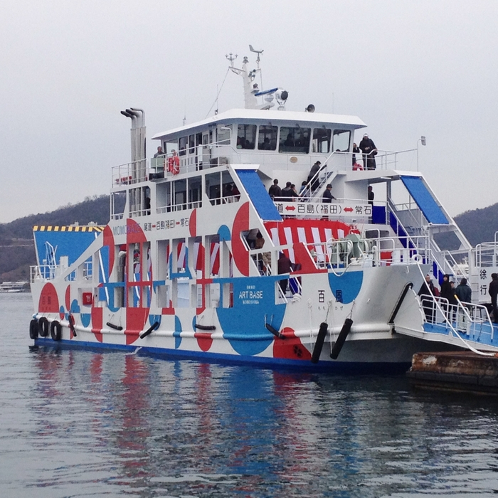 船名の百風は百島中学校の生徒によるネーミングで「百島に新しい風を吹かせる」の想いがこめられています。船体はアートベース百島がデザインし、ブルーと赤は、瀬戸内の海、風、太陽。ブルーと赤のハーモニーと、躍動感が感じられるようなデザインで、青と赤のさまざまな大きさの半円形が描かれています。