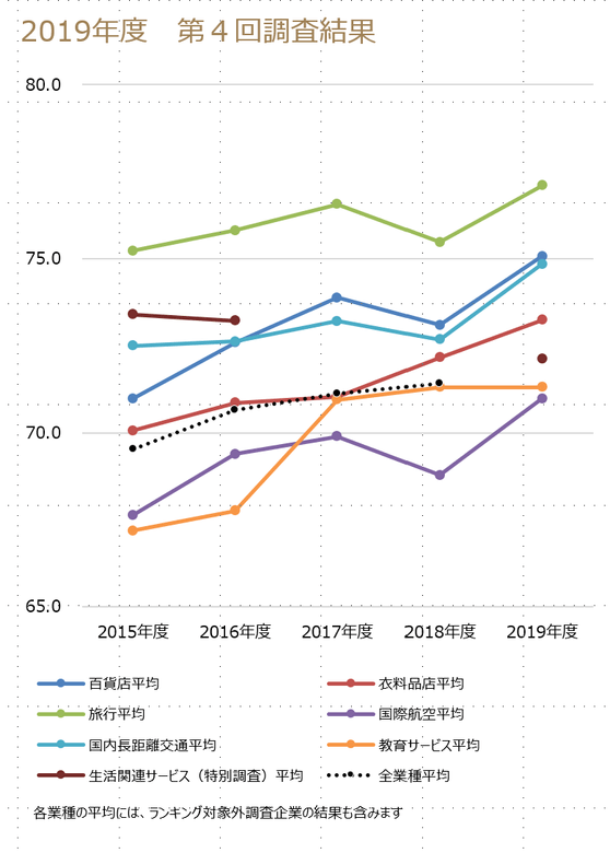 公益財団法人日本生産性本部 サービス産業生産性協議会は、2019年度JCSI(Japanese Customer Satisfaction Index:日本版顧客満足度指数)第4回調査として、7業種(百貨店、衣料品店、旅行、国際航空、国内長距離交通、教育サービス、生活関連サービス)の顧客満足度を発表しました。主な調査結果は以下の通りです。