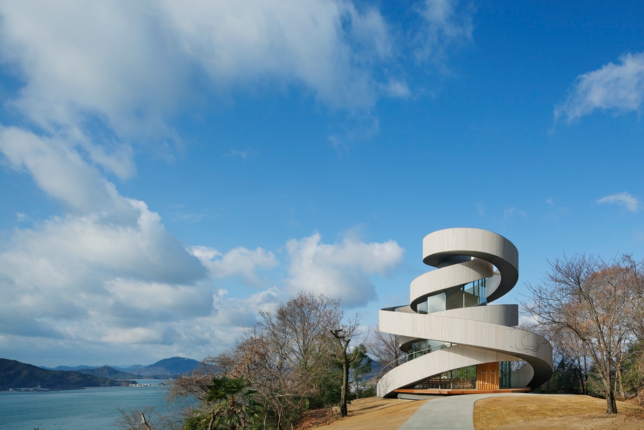 Completed in December 2013, the Ribbon Chapel is a small wedding chapel. Two spiral staircases are entwined like a ribbon around the chapel, smoothly joining at the top and, by supporting each other, they symbolize two people joining in matrimony. There is an observation deck at the top from which many islands of the Seto Inland Sea can be seen in a 360-degree panorama, and two people who have led separate lives can experience being together at the top of a ribbon of destiny. While it is normal for the bride and groom to equate walking down the virgin road with the path of life, this architecture aims to magnify that experience and move both the bride and groom as well as the guests.