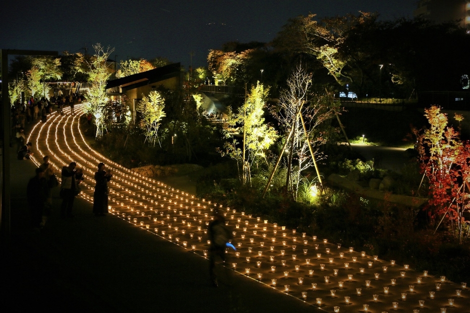 2017年にオープンした「草津川跡地公園de愛ひろば」であかり銀河が灯されます。この2日間だけ出現する約4,000灯の光の川は圧巻です。